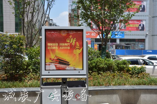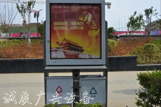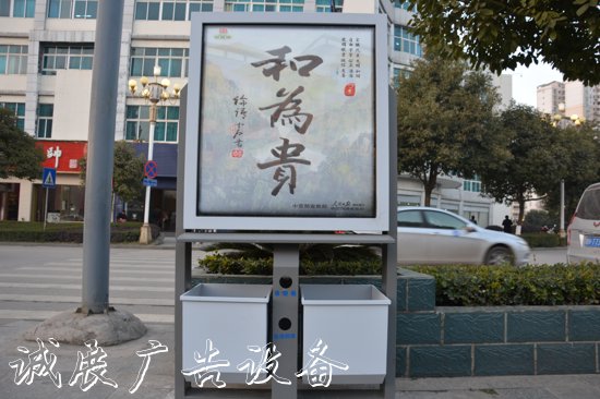 “和為貴”、“上善若水”、“人民有信仰·民族有希望·國家有力量”、“中國夢·我的夢”、“國家富強·民族振興·社會進步·人民幸?!钡裙鎻V告提升城市形象,扮靚城市美景。底部大容量的分類垃圾箱分為“投煙桶”、“電池回收”、“可回收垃圾”與“不可回收垃圾”, 提高垃圾的回收率,指路牌,節(jié)約寶貴資源,利國也利民。